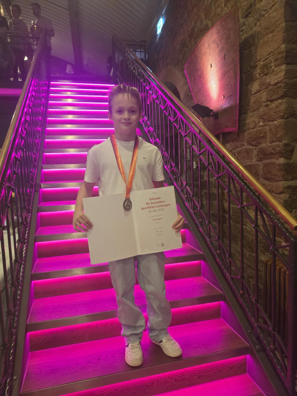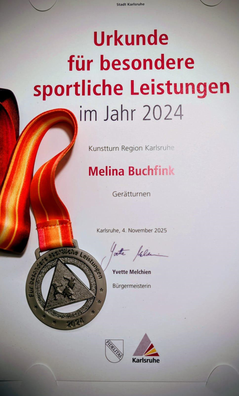 Unsere Sportbürgermeisterin Yvette Melchien überreichte Melina Buchfink, Leon Hägele, Elyas Maiga, Julia Betsch und Matilda Ertelt während einer tollen Veranstaltung auf der Bühne eine Urkunde. Geehrt werden alle Sportler, die einen Baden-Württembergischen und/oder Deutschen Meistertitel erturnen konnten.